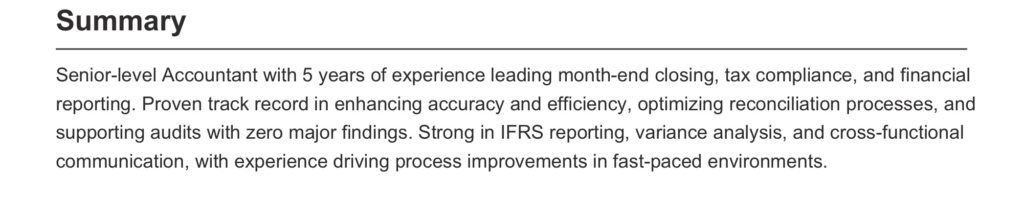 聯絡資料的下一個區塊,通常會放一段 Summary(個人簡介)或 Objective(求職目標)。英文履歷中這個區塊的功能很簡單,就是讓 HR 在短短幾秒內了解你是誰、你的背景是什麼,以及你能為公司帶來什麼價值。