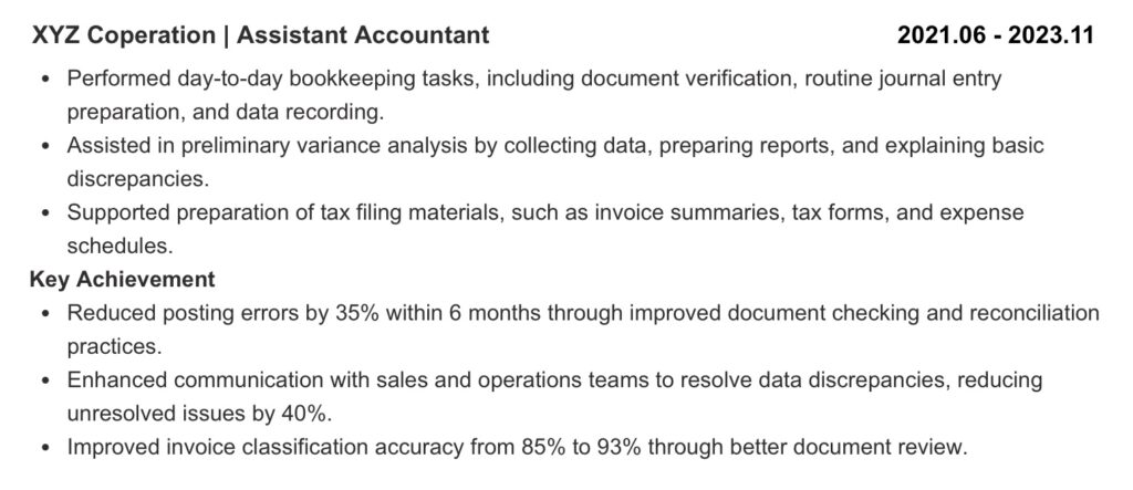 你有哪些成長的業績、幫助改善流程的、降本增效的、新研發、新開拓都可以適度的列舉在成就上,統一放在工作職責前後都行,用幾個要點敘述出來。